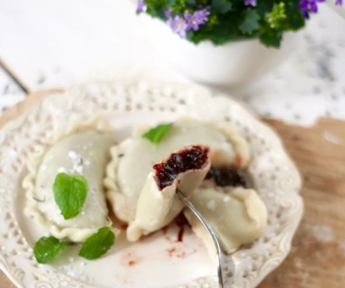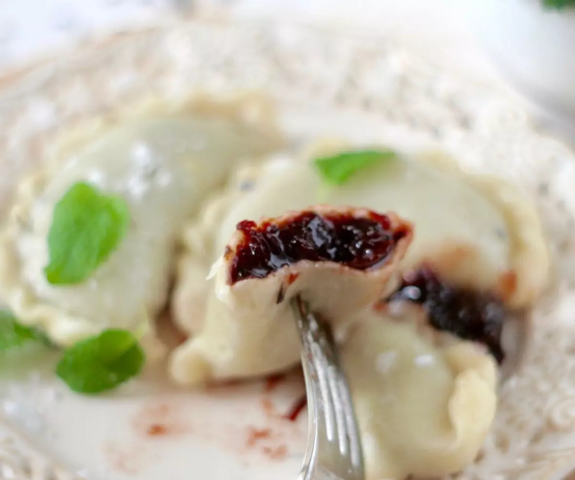 Rozwałkowane jak na pierogi ciasto nałożyć powidłami, zaprawiwszy je wprzód cukrem albo konfiturami, robić małe pierożki, smarując brzegi białkiem, wrzucić do gotującej się wody, jak spłyną wybrać durszlakową łyżką na półmisek i polać śmietaną.