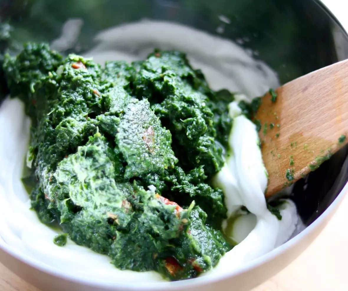 Aby masa szpinakowa była puszysta, to łączę ją z dobrze ubitymi białkami. Ważne, żeby składniki ze sobą dobrze wymieszać ale nie staraj się uzyskać jednolitej konsystencji. Pęcherzyki powietrza w białkach są cenne bo dzięki nim masa będzie lepiej smakować.