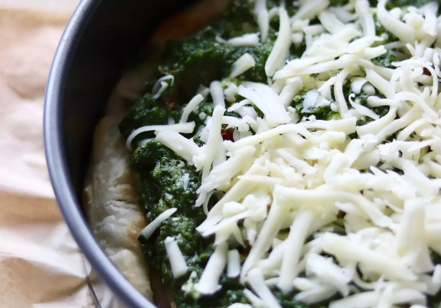 Na podpieczony spód można położyć kilka plasterków ulubionego żółtego sera aczkolwiek to nie jest konieczne. Wykładam część masy szpinakowej. Na to wykładam przygotowany wcześniej sos beszamelowy. W końcu wykładam resztę masy szpinakowej i na koniec posypuję całość mozarellą. Wstawiam do piekarnika na ok. 20 minut. I gotowe! :)