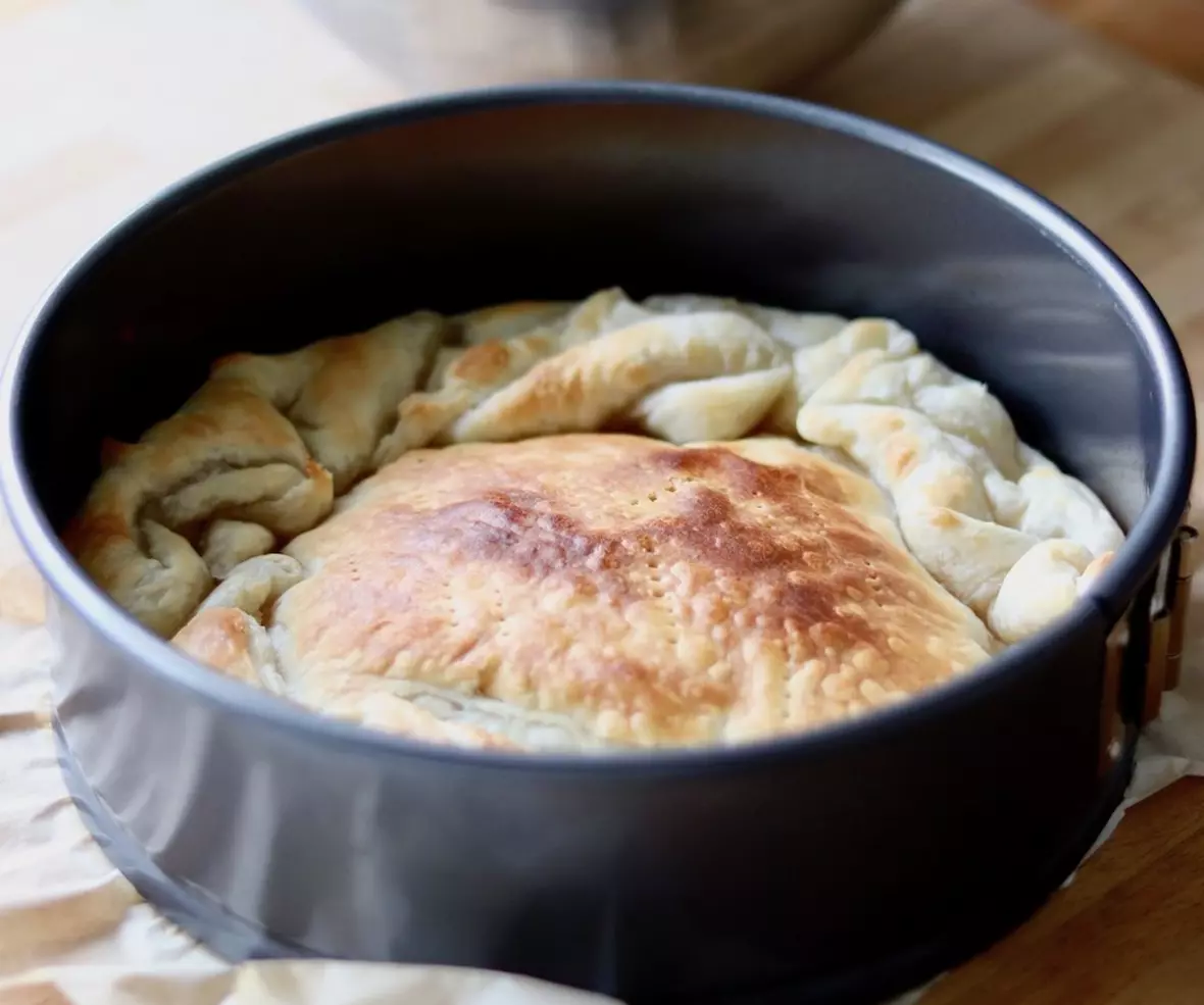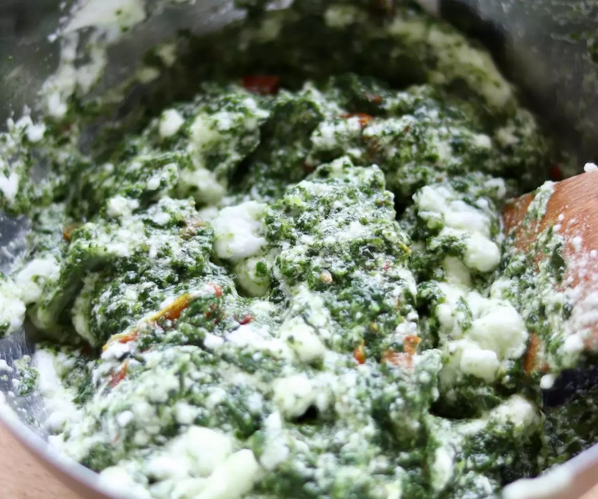 Nadzienie też nie jest czasochłonne. Mrożony szpinak podgrzewam, a następnie studzę. Dodaję do niego pokrojone suszone pomidory i przyprawiam solą i pieprzem.