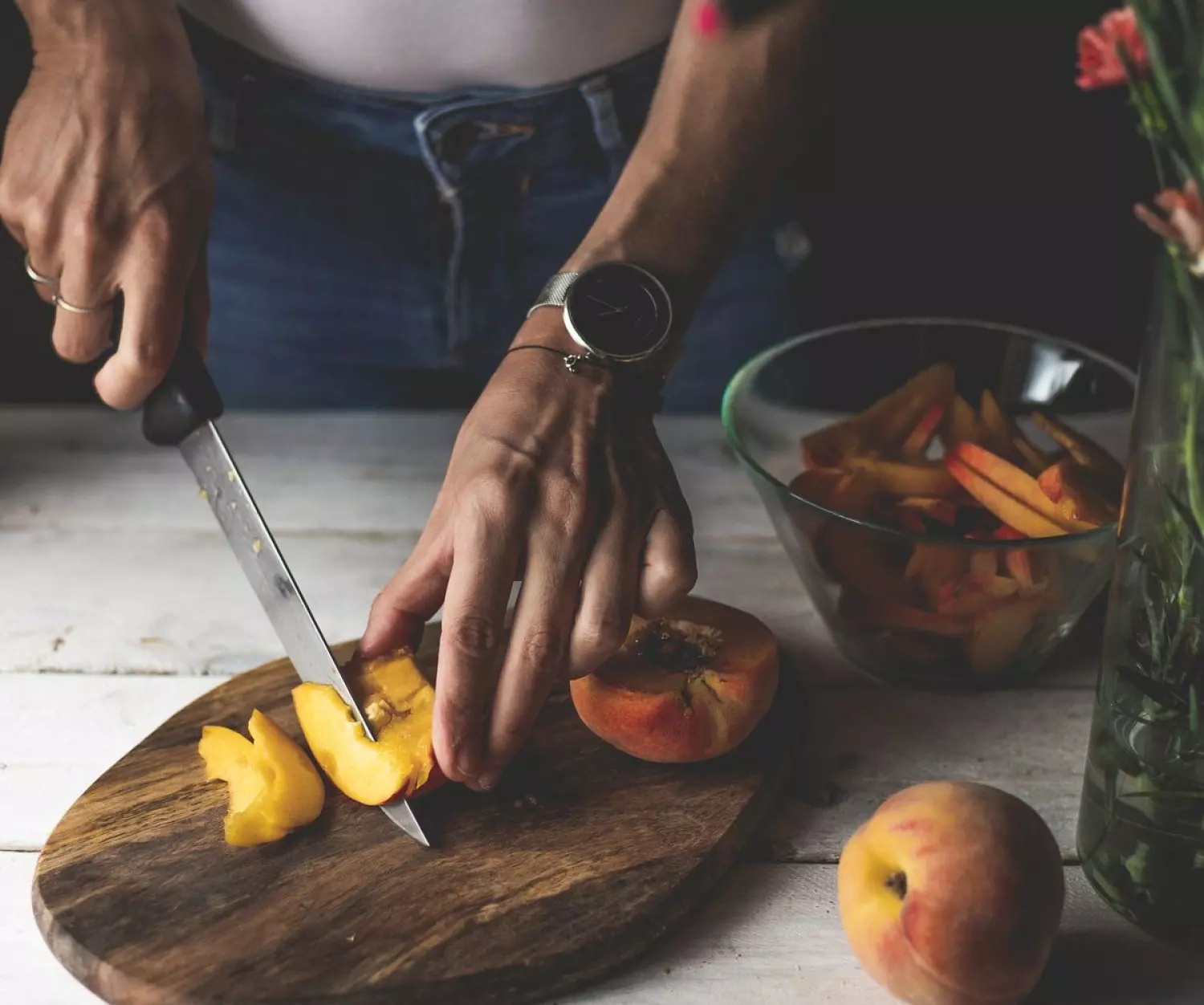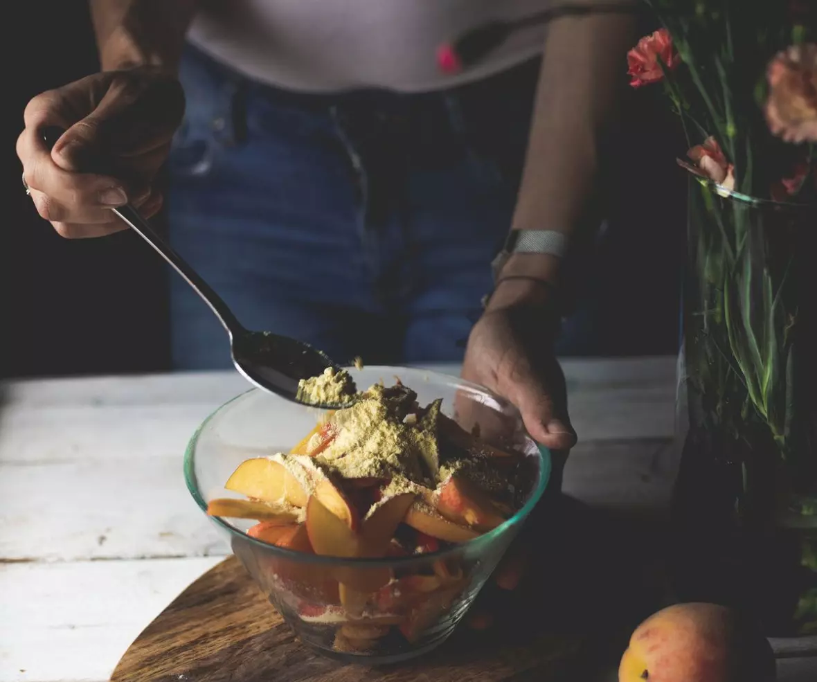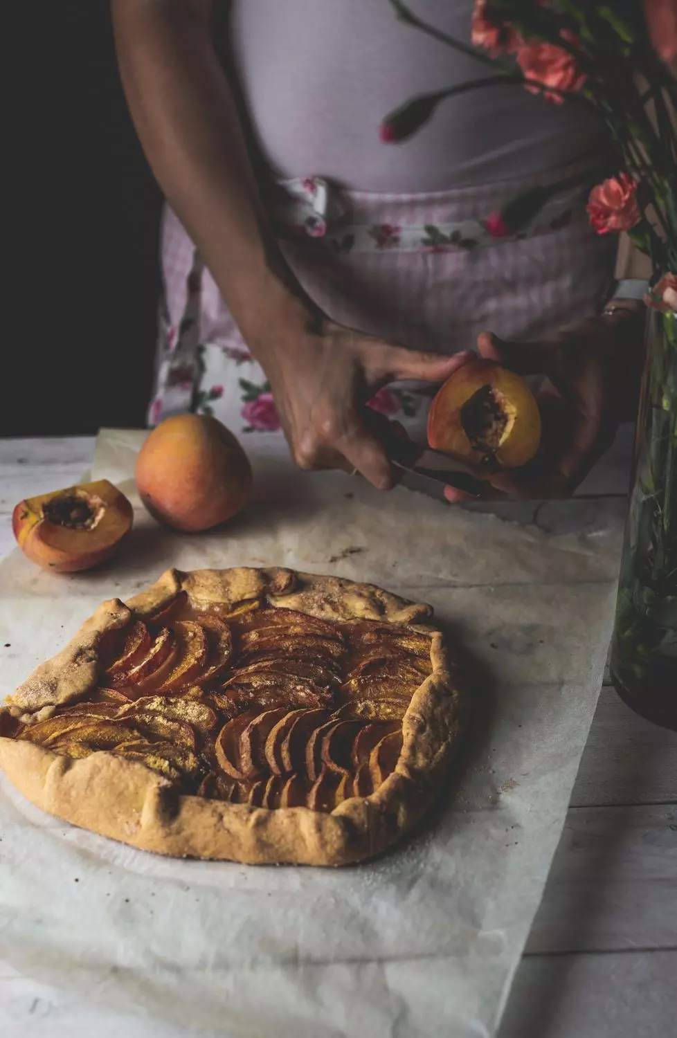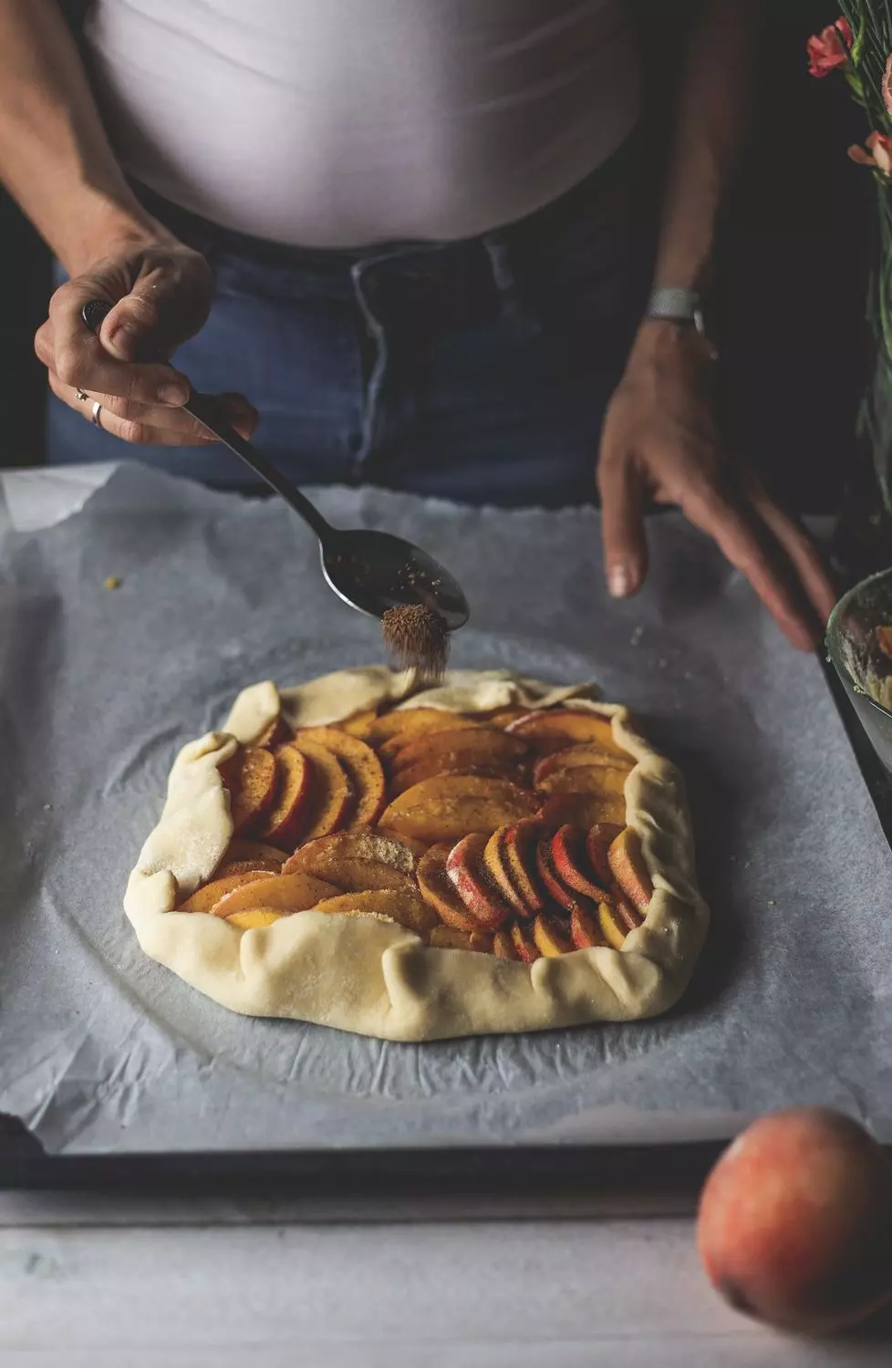 Brzoskwinie, zresztą tak jak większość owoców, podczas pieczenia puszczają sok. Oznacza to, że warto dodać odrobinę mąki kukurydzianej. Dzięki temu sok podczas pieczenia fajnie się zagęszcza, a ciasto zachowuje swoją chrupkość. Mąką kukurydziana jest żółta, więc nie będzie się też na owocach odznaczać.